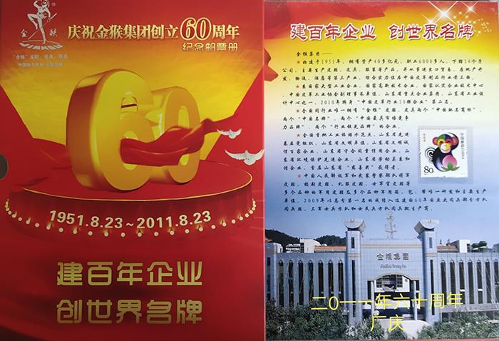 記憶四:精美紀念郵票冊——2011年金猴創立60周華誕時企業給職工發的精美紀念郵票冊。此時,金猴集團走過了六十年的風雨歷程,迎來了一個嶄新的歷史高度。在過去的黃金十年里,企業從占地20畝的老廠區搬遷到了占地350畝的花園式工業園區,生產規模大幅度提高,建立了國家認定企業技術中心,爭創了威海第一個馳名商標和第一個中國名牌,斬獲了山東省“省長質量獎”。在主業實現跨越式發展的同時,進出口貿易、房地產開發、酒店、商業、投資等第三產業也干得風生水起。集團董事長出身軍人家庭,自己又在部隊的大熔爐里摸爬滾打了幾年,對部隊有著血濃于水的感情,為軍隊被裝建設服務是他一直以來的夢想,自2009年以來,公司實施軍民融合發展戰略,先后為解放軍和武警部隊研發生產了50多個品種的軍用皮鞋和皮具產品,最令金猴人驕傲和自豪的是金猴產品成功亮相國慶60周年閱兵式接受全國人民共同檢閱,當閱兵方隊穿著金猴閱兵鞋靴通過天安門廣場的時候,金猴人此刻激動的心情是無法用語言表達的……為紀念金猴集團走過的六十年風雨歷程,感謝社會各界、廣大消費者對金猴的支持和厚愛,感謝金猴集團全體干部員工的辛勤工作與赤誠奉獻,金猴集團制作了這套60周年廠慶紀念郵票冊,留下永遠的紀念和美好的回憶。