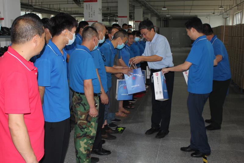 8月7日,威海市總工會黨組成員、經審會主任王慶文、辦公室主任趙旭剛在集團公司工會主席鄒曉伍的陪同下,冒著酷暑高溫走進鞋業公司制鞋七車間,為正在趕制火箭軍專用作戰防護靴等軍品訂單的一線職工送去茶葉、洗化套裝等防暑降溫用品,以表達工會組織對廣大職工的貼心關懷。