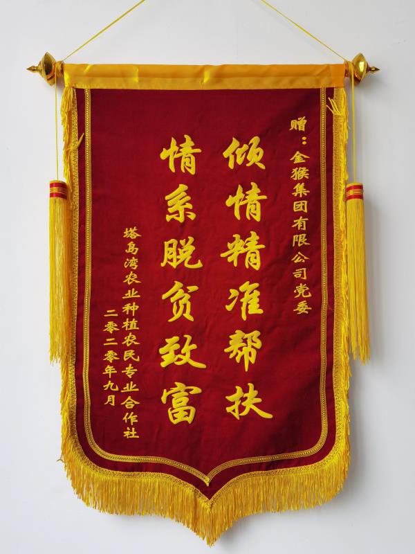 近日,乳山市塔島灣農業種植農民專業合作社給集團黨委送來書有“傾情精準幫扶 情系脫貧致富”的錦旗,以感謝金猴集團在消費扶貧工作中對他們的支持和幫助。
