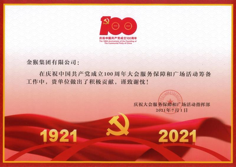 近日,中國共產黨成立100周年慶祝大會服務保障和廣場活動指揮部工作總結大會在北京召開,表彰在慶祝中國共產黨成立100周年大會服務保障和廣場活動籌備工作中做出積極貢獻的單位和個人,金猴集團有限公司及宋鴻濤、王愛國、王福全、于杰四名同志被授予獎狀和證書。